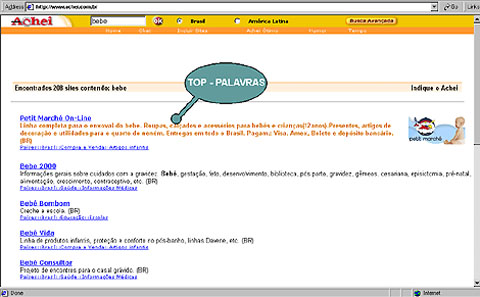 Top-Palavras O que é? Uma ou mais palavras escolhidas pelo cliente, que quando pesquisadas posicionam o seu site entre os primeiros resultados. Formato O anúncio é exclusivamente em formato texto. Vantagens - Atinge a um público alvo - Maior percentual de visitas - Ligação direta com o internauta, permitindo uma descrição mais completa sobre a empresa, o produto ou serviço oferecido |